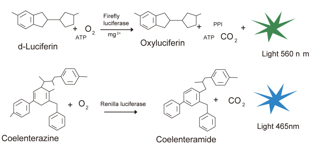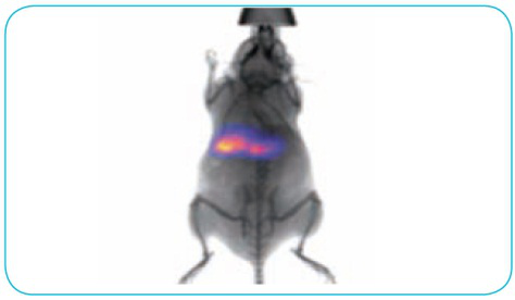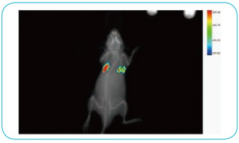 生物发光一般是将荧光素酶(Firefly luciferase)基因整合到将要观察的目标细胞染色体DNA上以表达荧光素酶,细胞发生分裂、转移、分化时,荧光素酶也在特定细胞株上持续稳定表达。荧光素酶基因可标记基因、细胞以及活体动物。将标记好的细胞接种到实验动物体内,通过腹腔或静脉注射给予外源底物荧光素 (luciferin),即可在几分钟内产生发光现象。这种酶需要ATP 和氧才能催化荧光素氧化反应,因此只有在活细胞内才会发光,且发光光强度与标记细胞的数目线性相关,锐博生物提供优质可靠的生物发光成像检测服务。