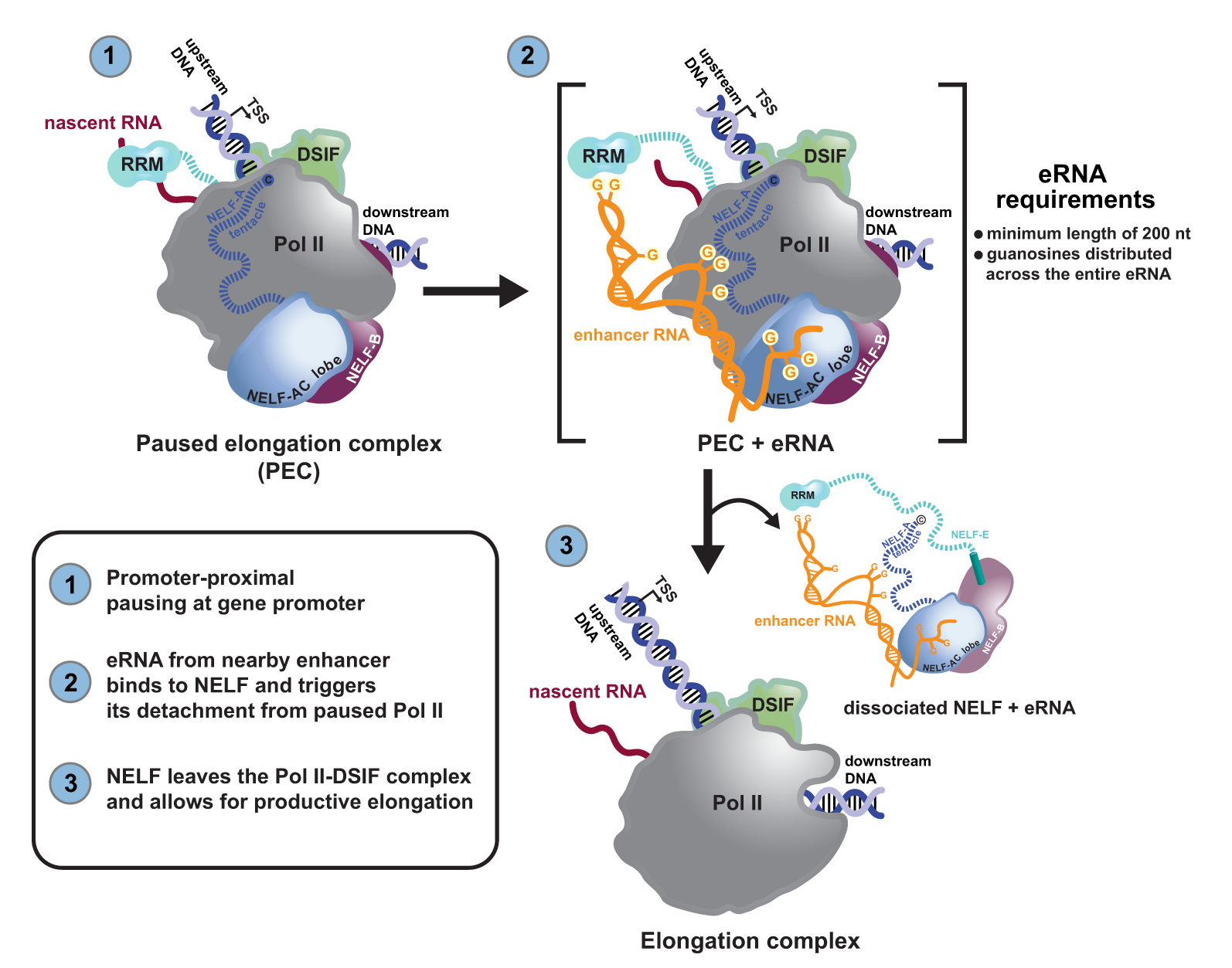 Fig4. eRNA和暂停延伸复合物(PEC)之间的多价变构相互作用刺激Pol II暂停释放模型示意图