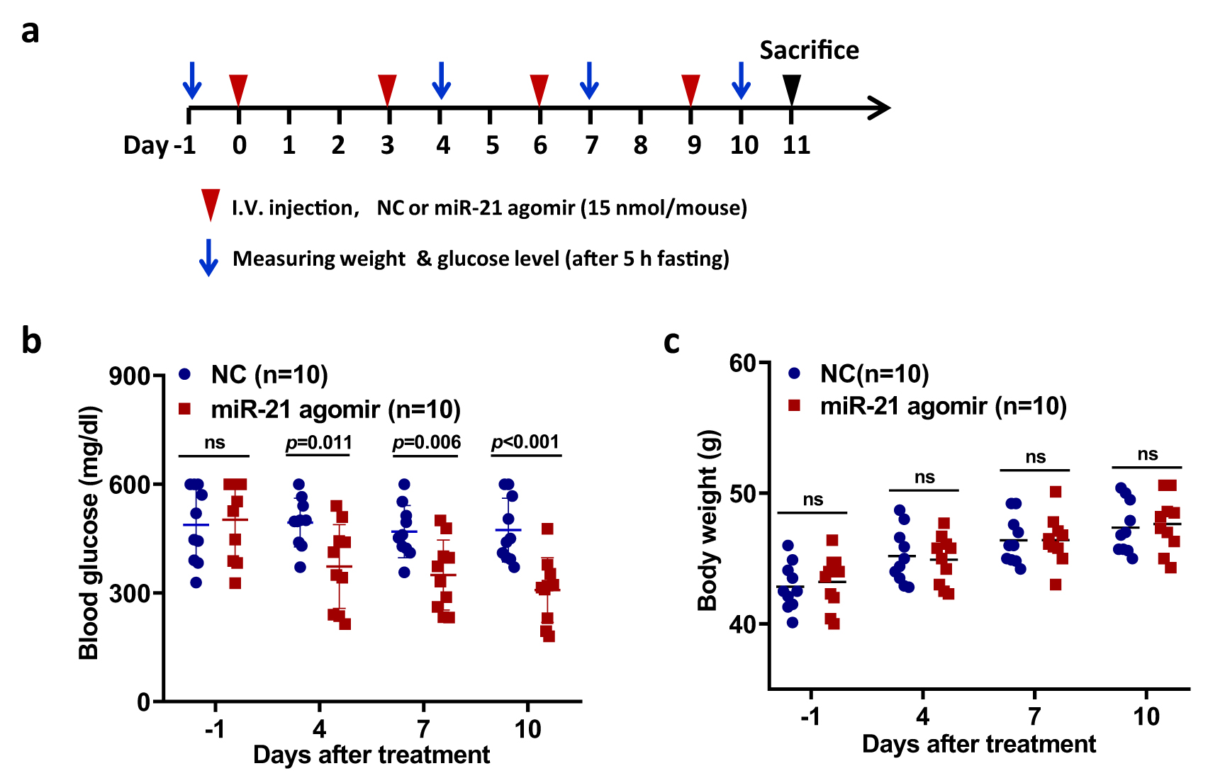 Fig1. 将miR-21 agomir递送至2型糖尿病db/db小鼠的胰腺可降低血糖水平