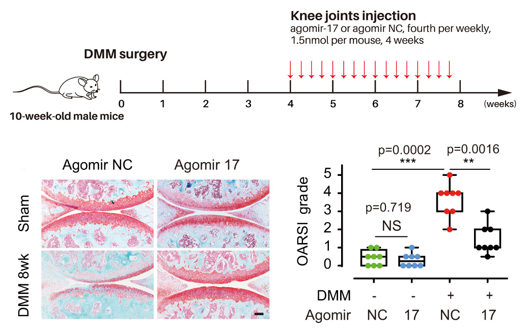 动物模型:DMM诱导的OA小鼠模型(随机分为4组,agomir-17组、agomir-NC组)