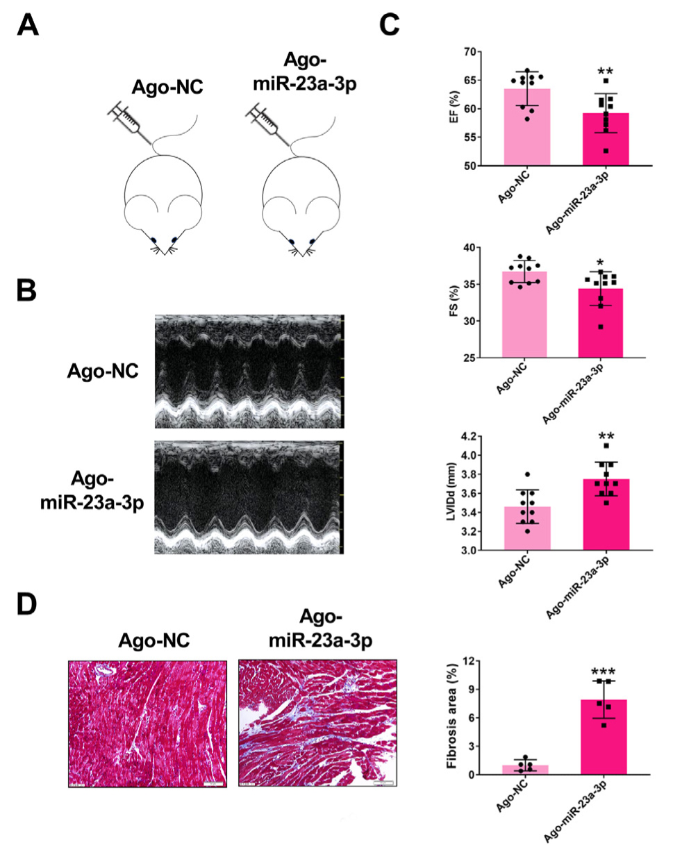 Fig5. 注射agomiR-23a-3p的小鼠表现出心脏功能恶化,胶原蛋白显著沉积